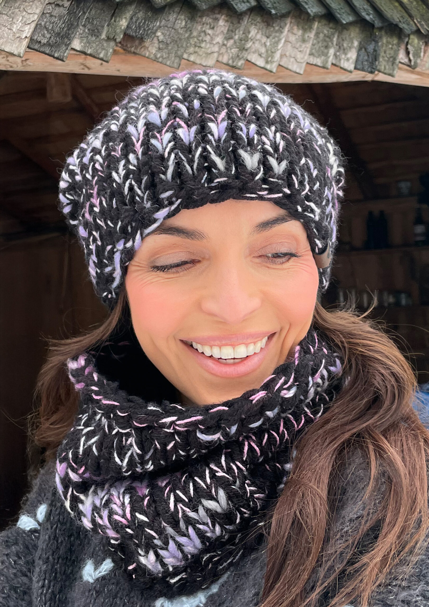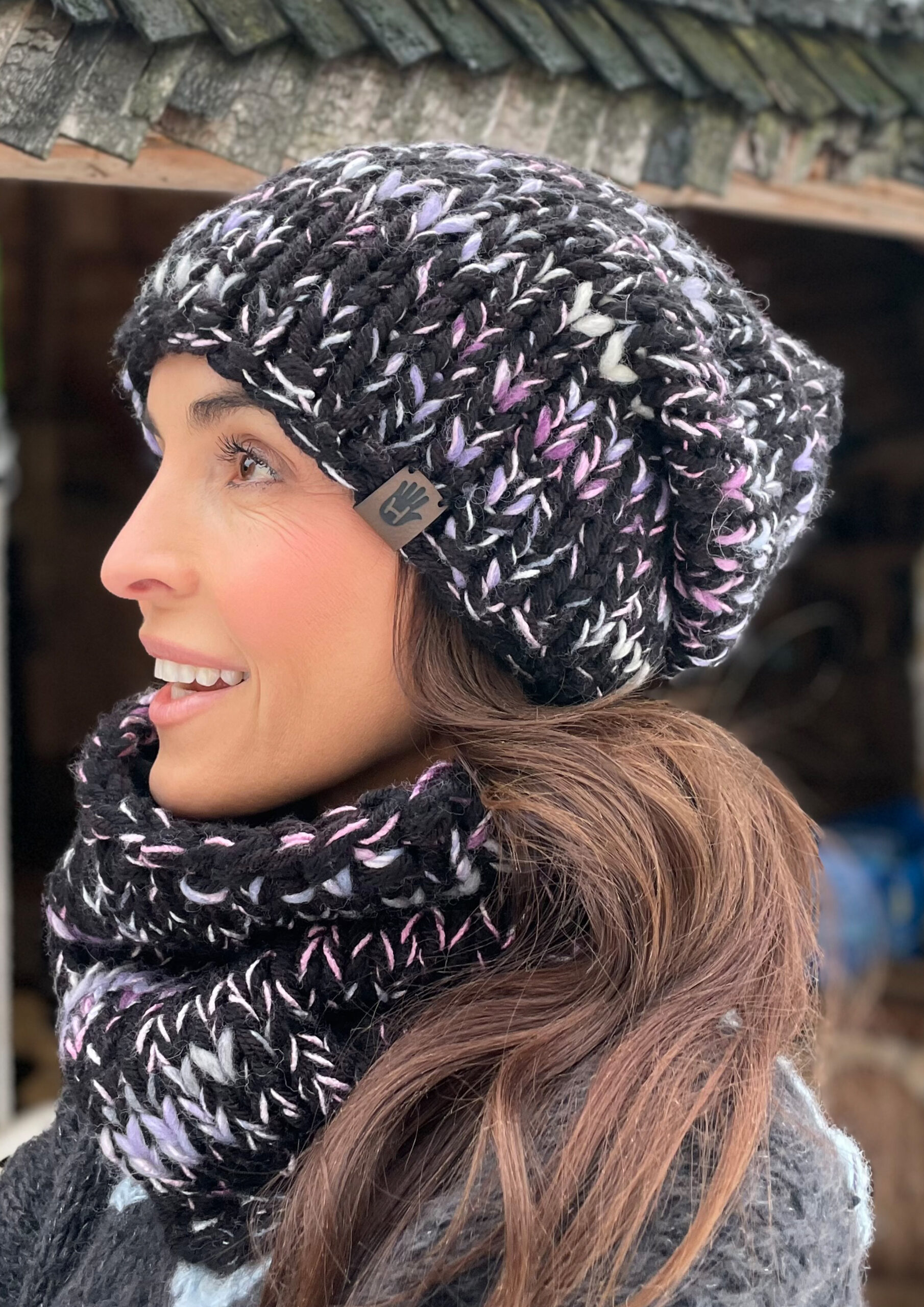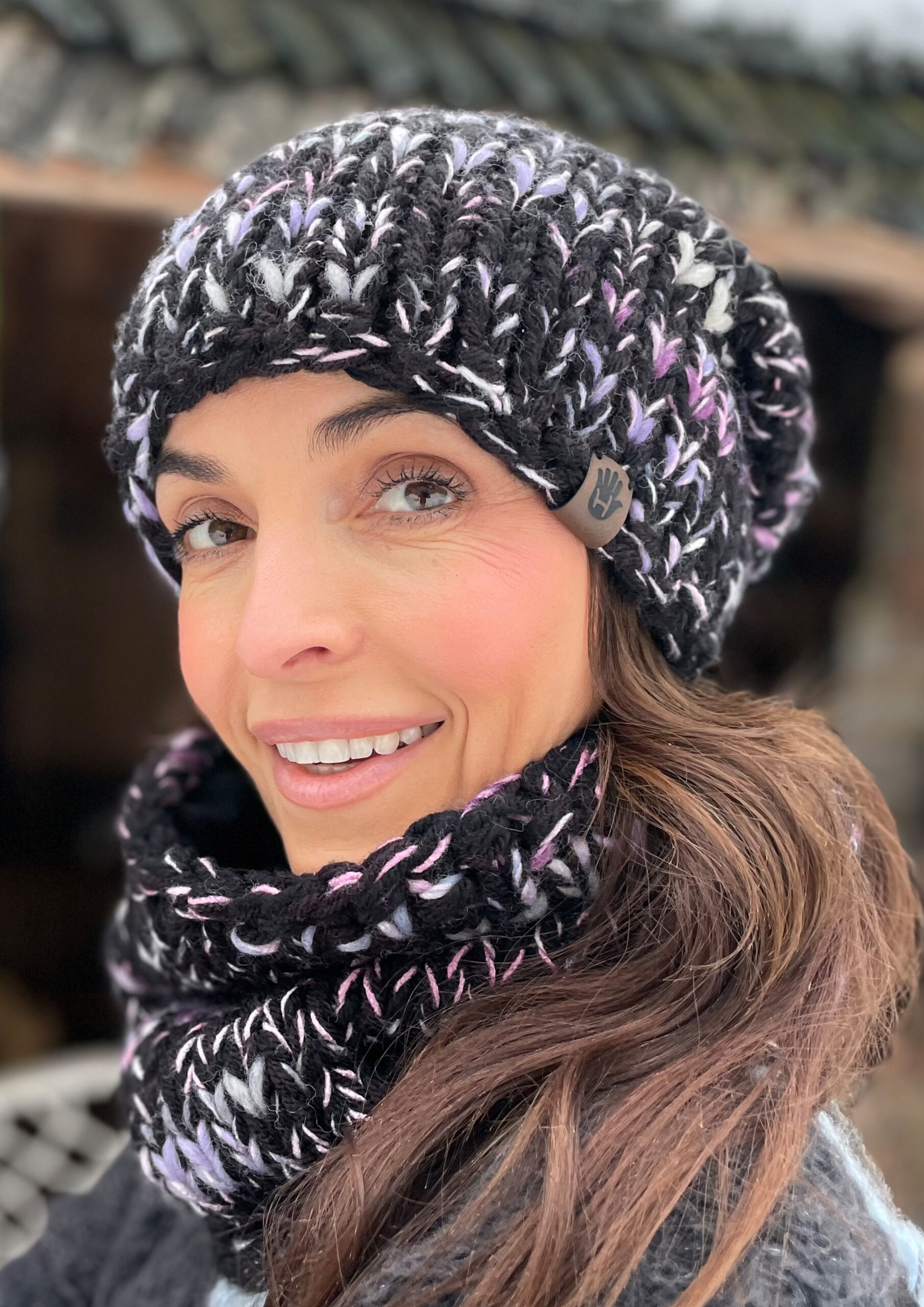 Komplet czerń z fioletem to ręcznie robione dzieło wykonane na drutach bezszwowo z dbałością o każdy detal. Miękka i przyjemna w dotyku, doskonale dopasowuje się do głowy. Wewnątrz wszyta jest delikatna opaska polarowa, która zapewnia dodatkowy komfort noszenia w chłodne dni.