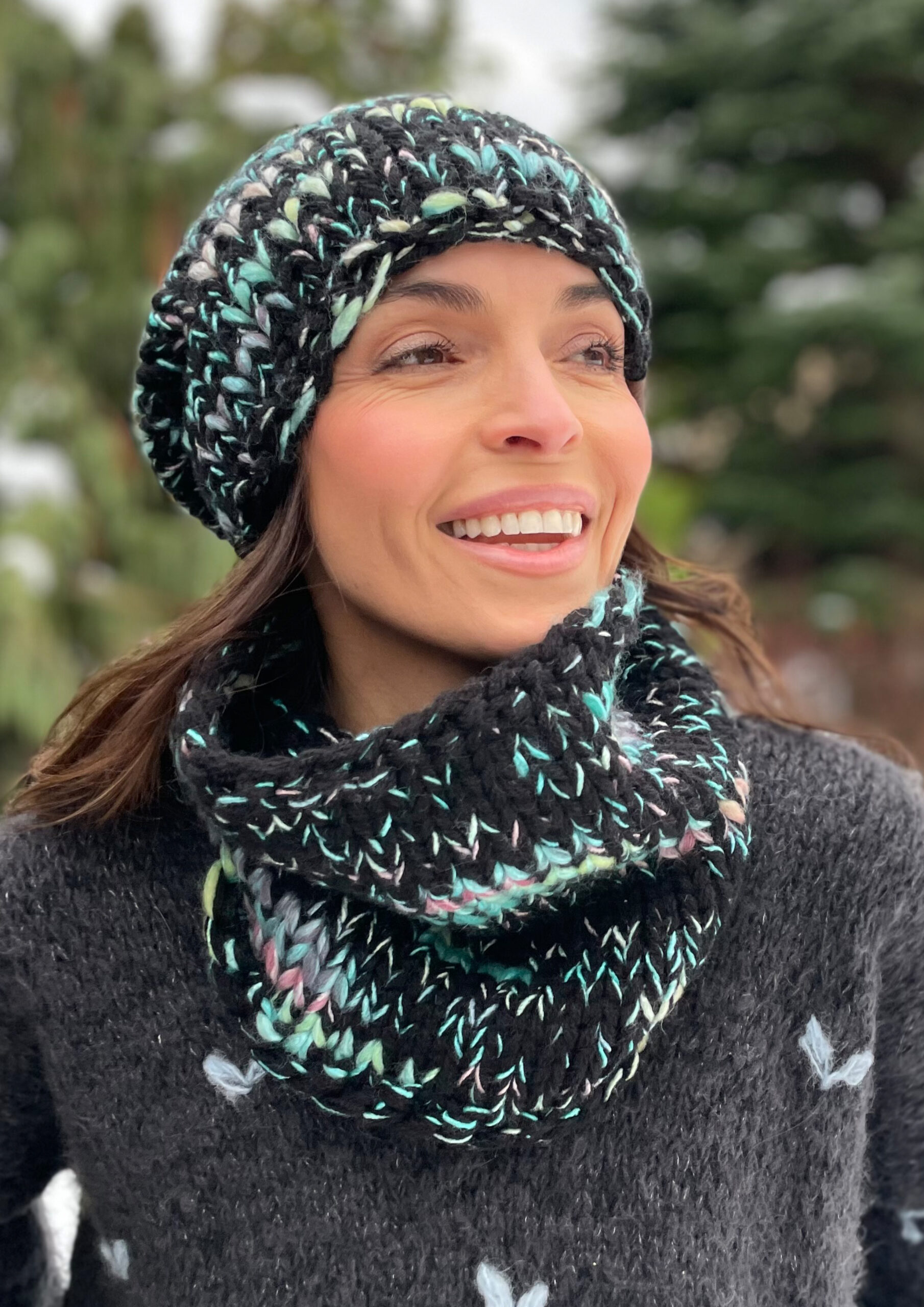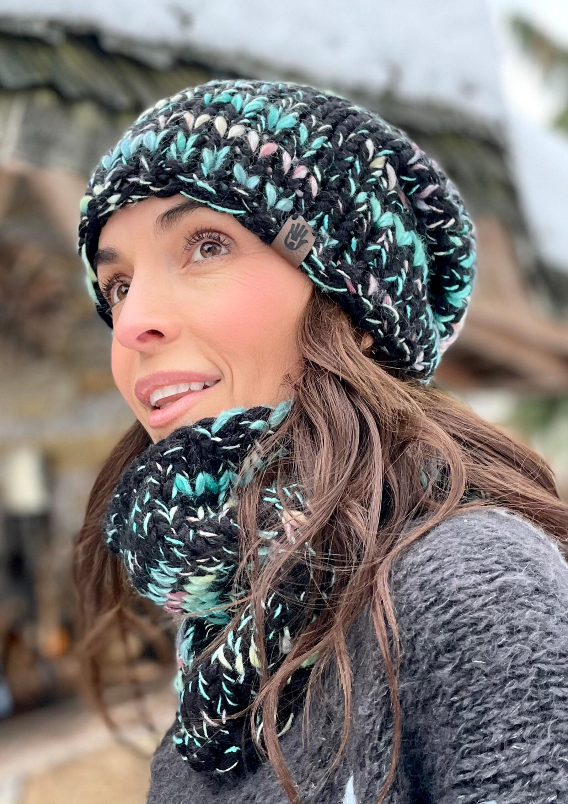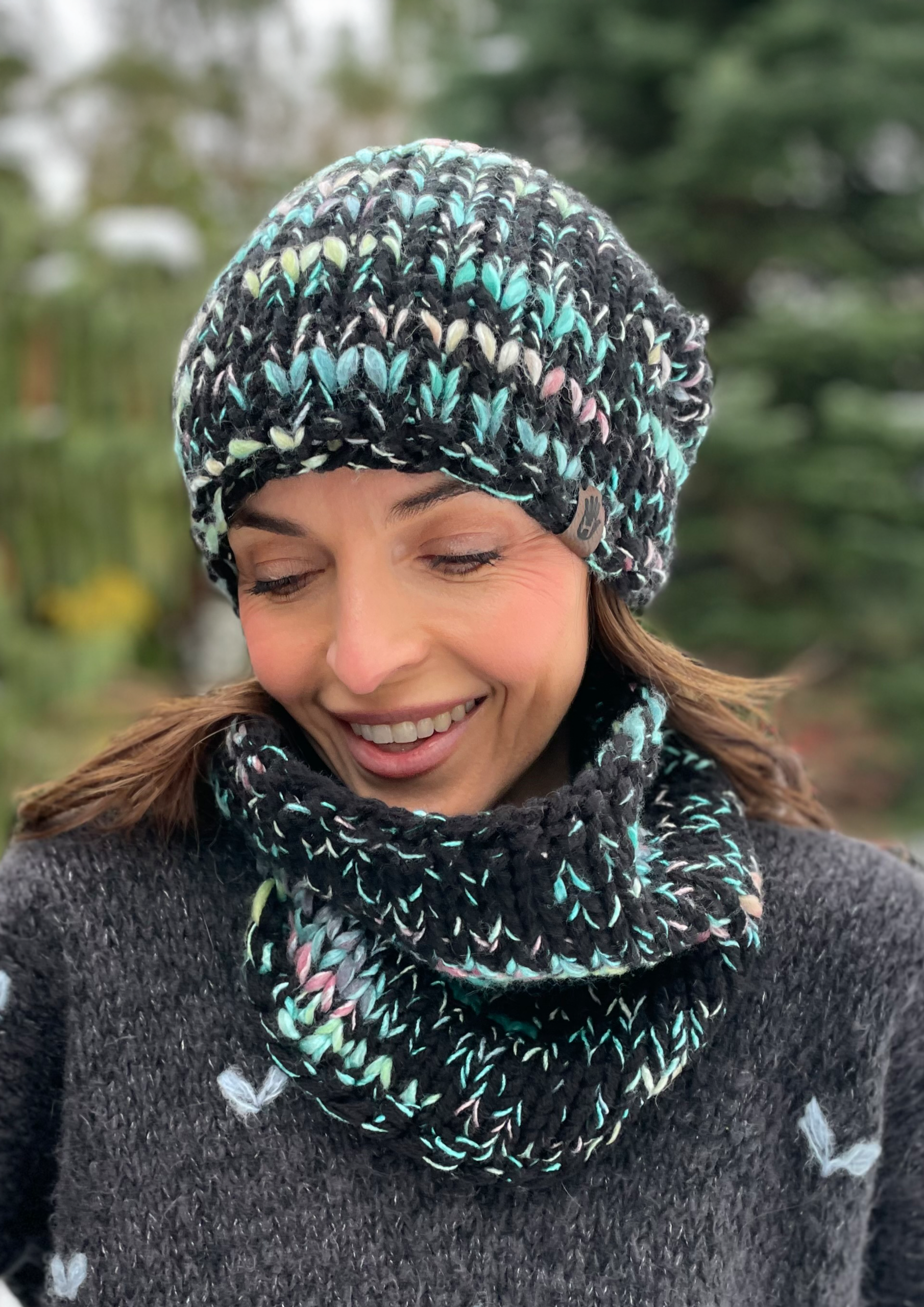 Komplet Czerń z Miętą to ręcznie robione dzieło wykonane na drutach bezszwowo z dbałością o każdy detal. Miękka i przyjemna w dotyku, doskonale dopasowuje się do głowy. Wewnątrz wszyta jest delikatna opaska polarowa, która zapewnia dodatkowy komfort noszenia w chłodne dni.
