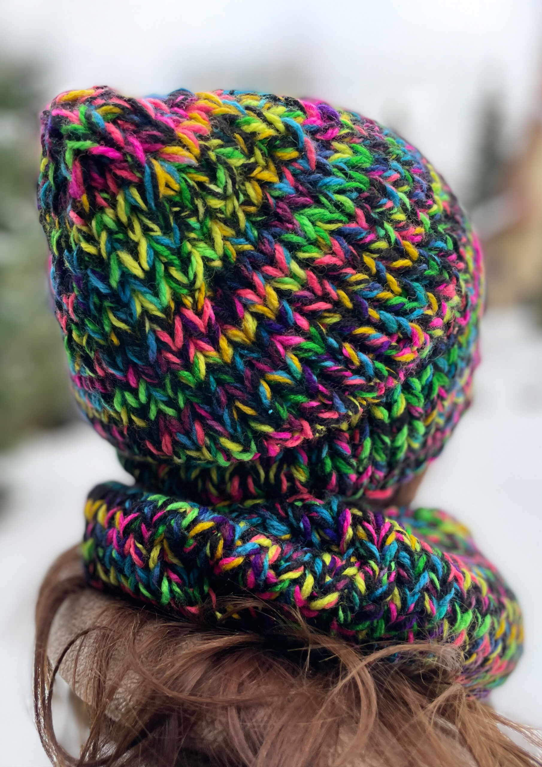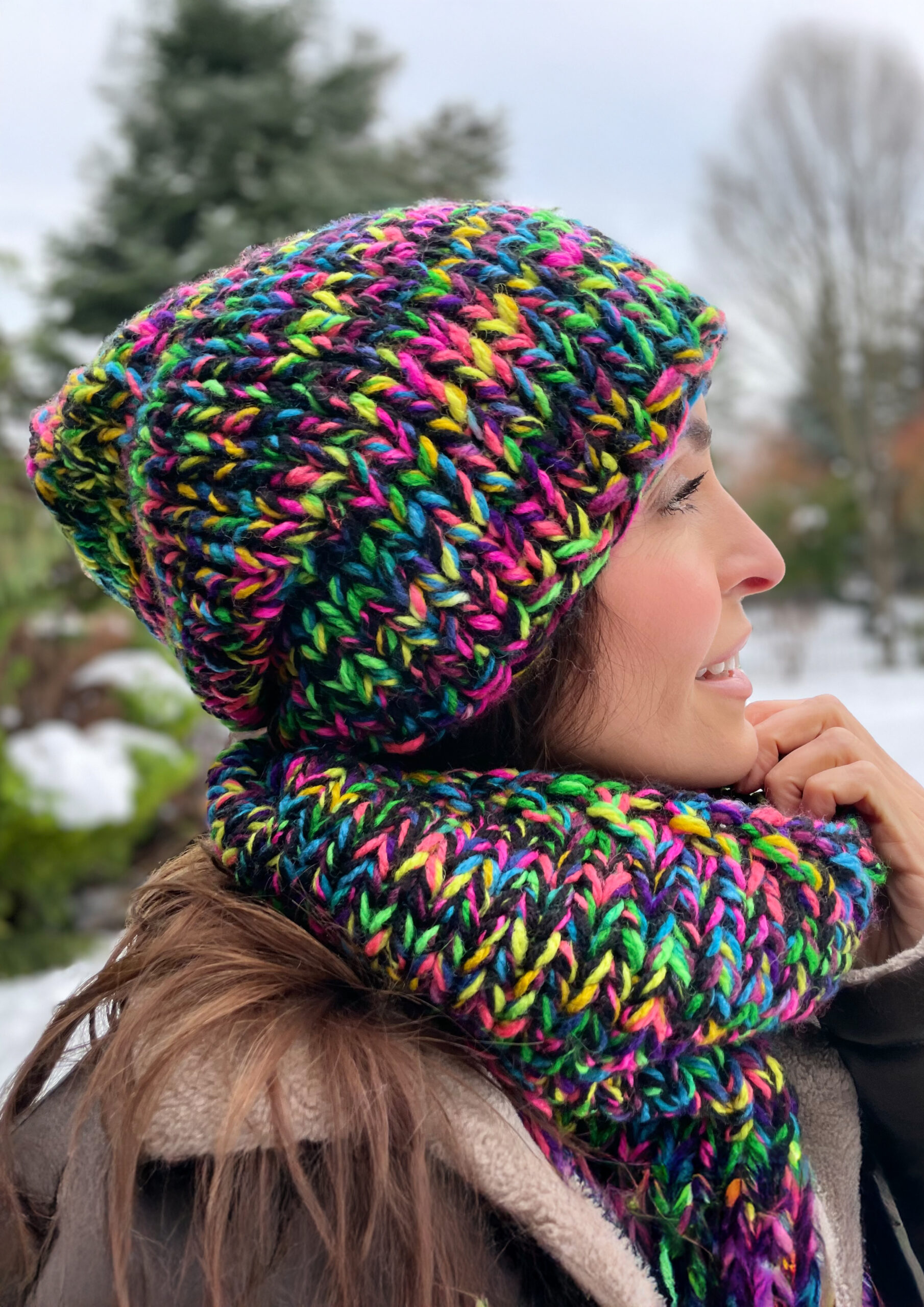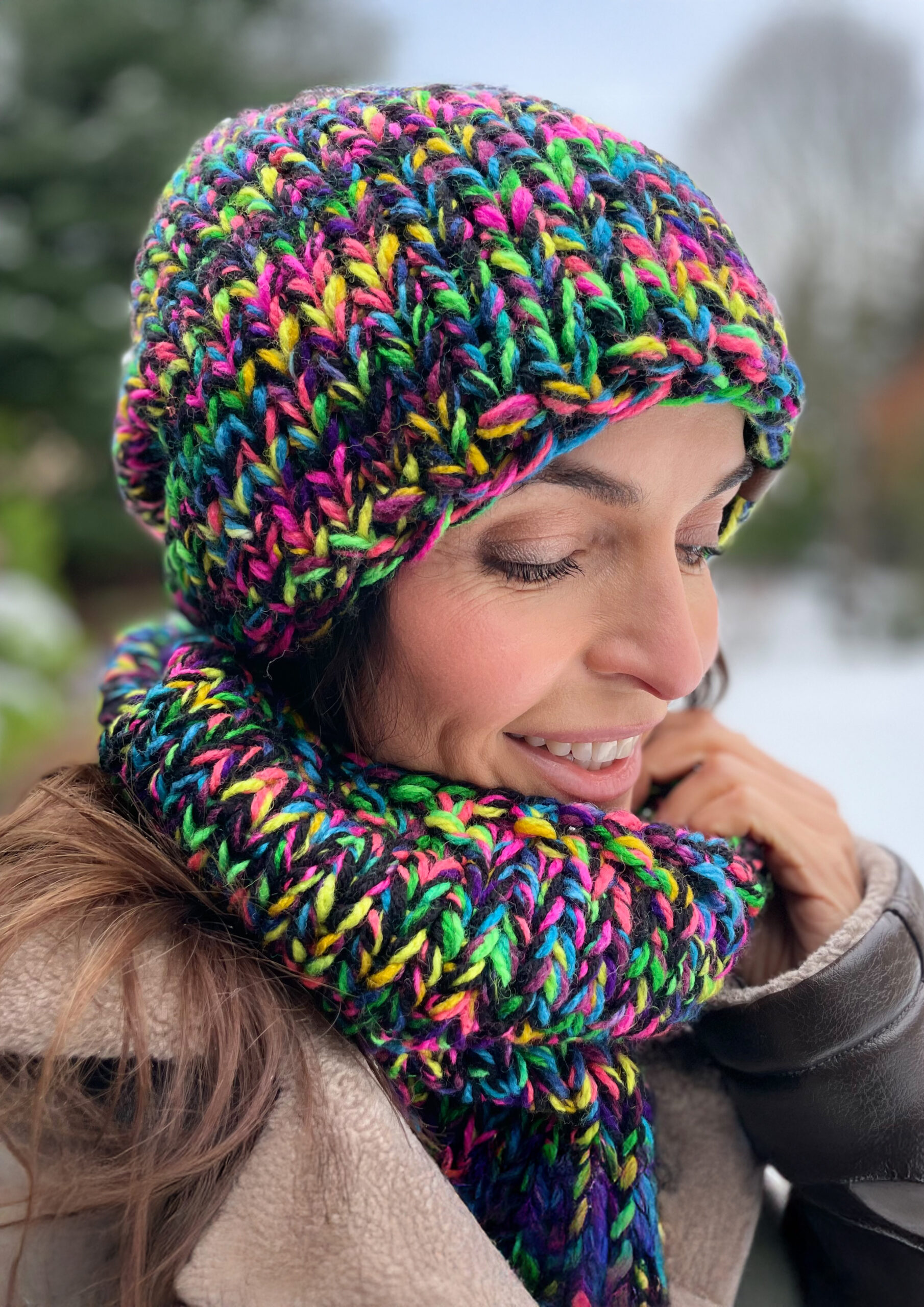 Komplet Multicollor green to ręcznie robione dzieło wykonane na drutach bezszwowo z dbałością o każdy detal. Miękka i przyjemna w dotyku, doskonale dopasowuje się do głowy. Wewnątrz wszyta jest delikatna opaska polarowa, która zapewnia dodatkowy komfort noszenia w chłodne dni.