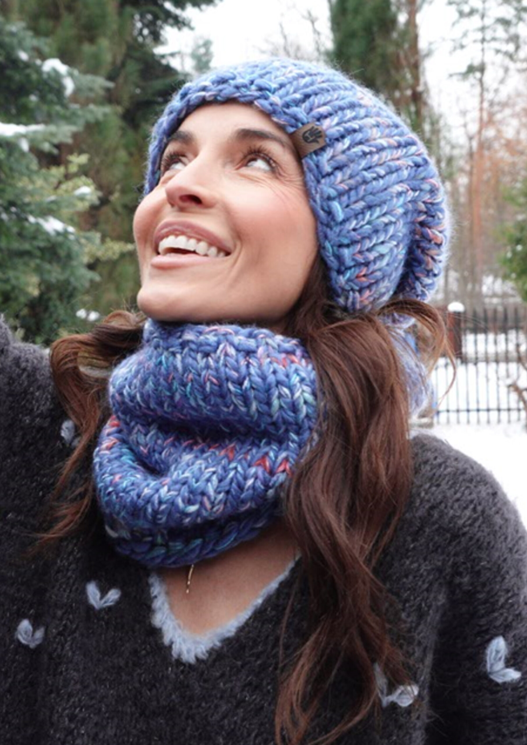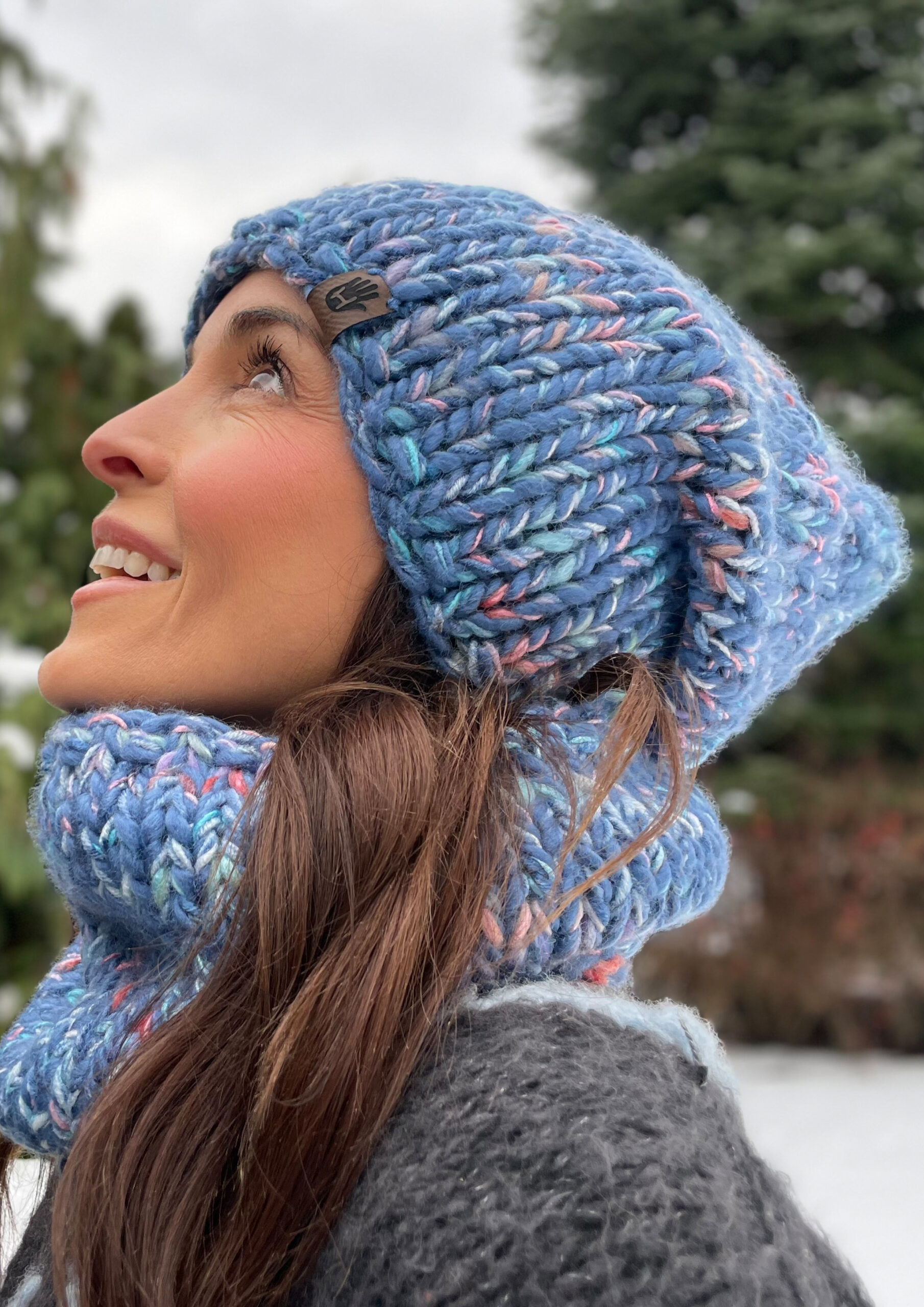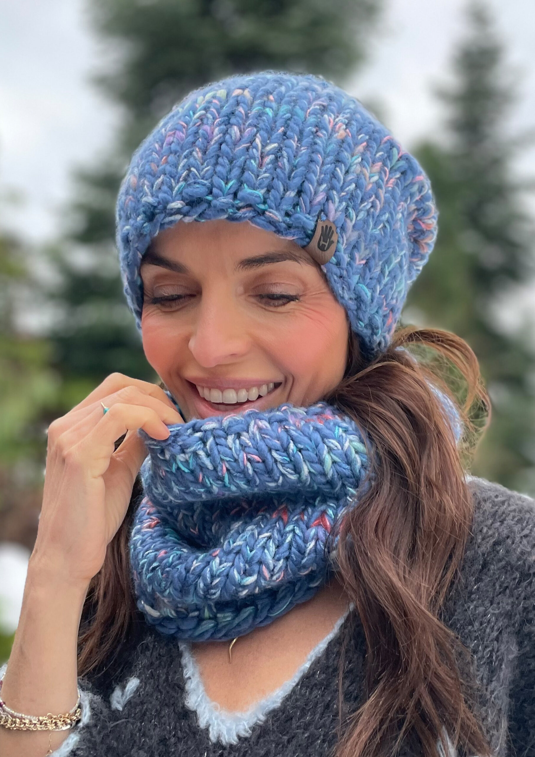 Komplet Niebieska Melodia to ręcznie robione dzieło wykonane na drutach bezszwowo z dbałością o każdy detal. Miękka i przyjemna w dotyku, doskonale dopasowuje się do głowy. Wewnątrz wszyta jest delikatna opaska polarowa, która zapewnia dodatkowy komfort noszenia w chłodne dni.