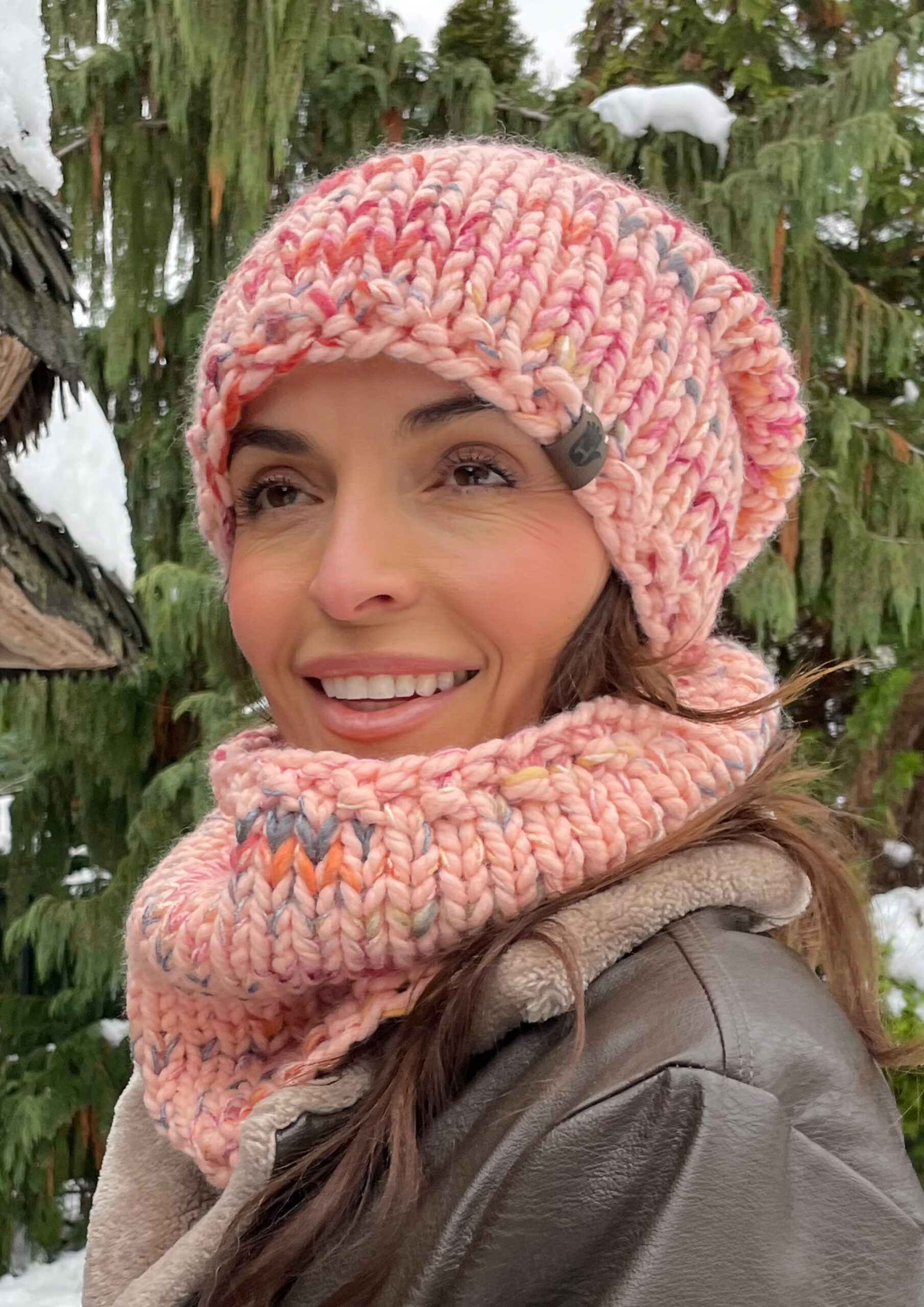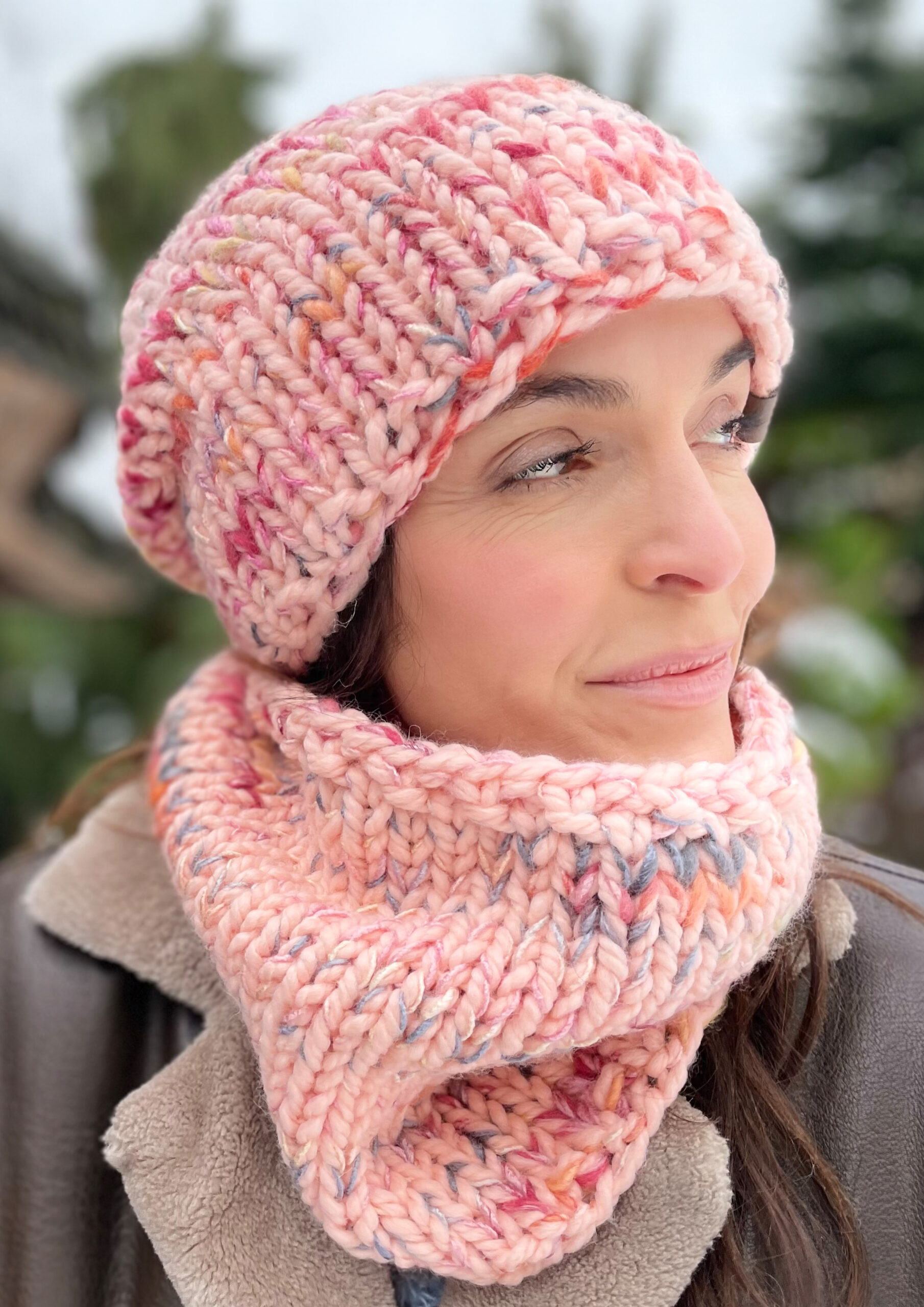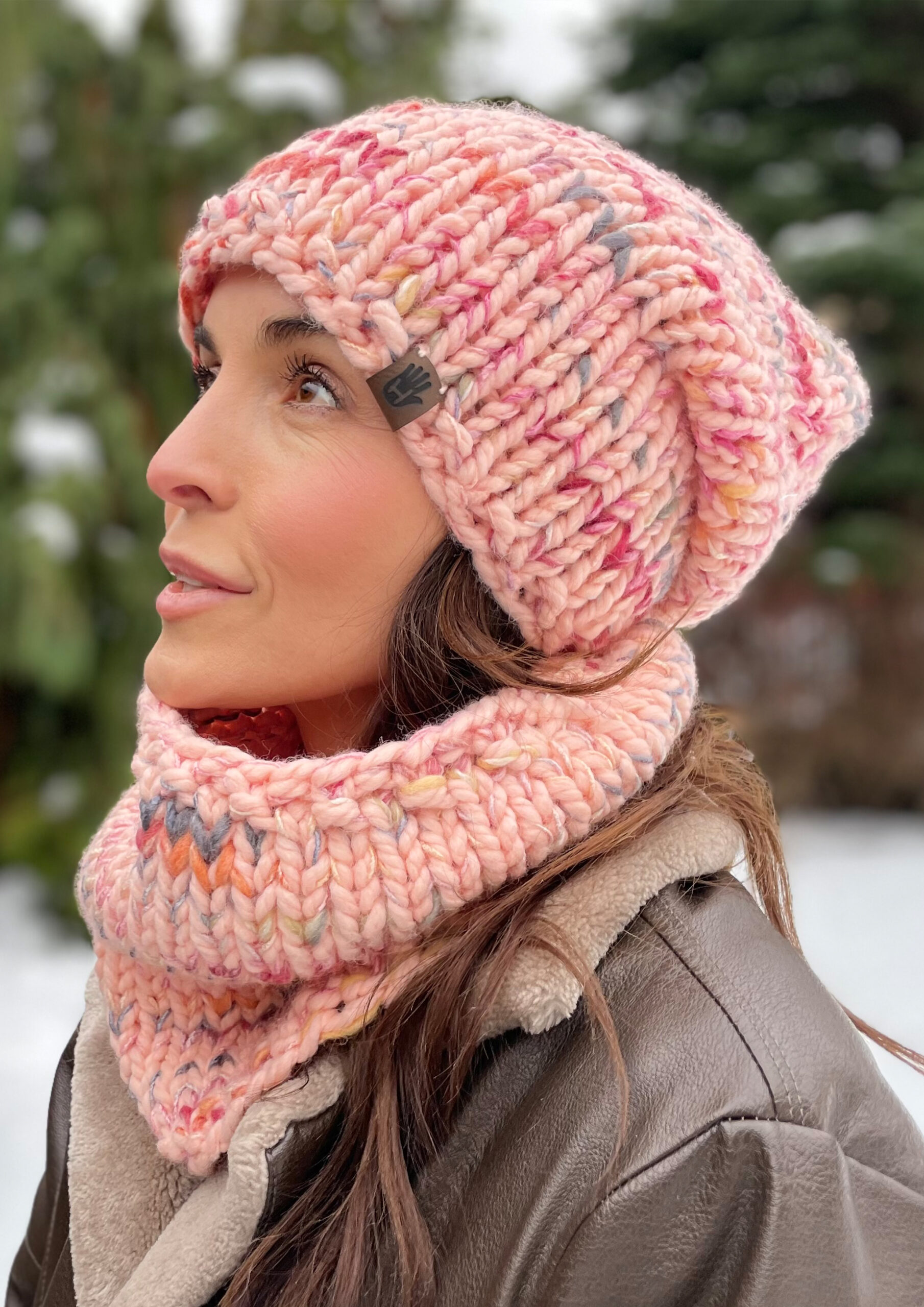 Komplet Różowa Harmonia to ręcznie robione dzieło wykonane na drutach bezszwowo z dbałością o każdy detal. Miękki i przyjemny w dotyku, doskonale dopasowuje się do głowy. Wewnątrz wszyta jest delikatna opaska polarowa, która zapewnia dodatkowy komfort noszenia w chłodne dni.