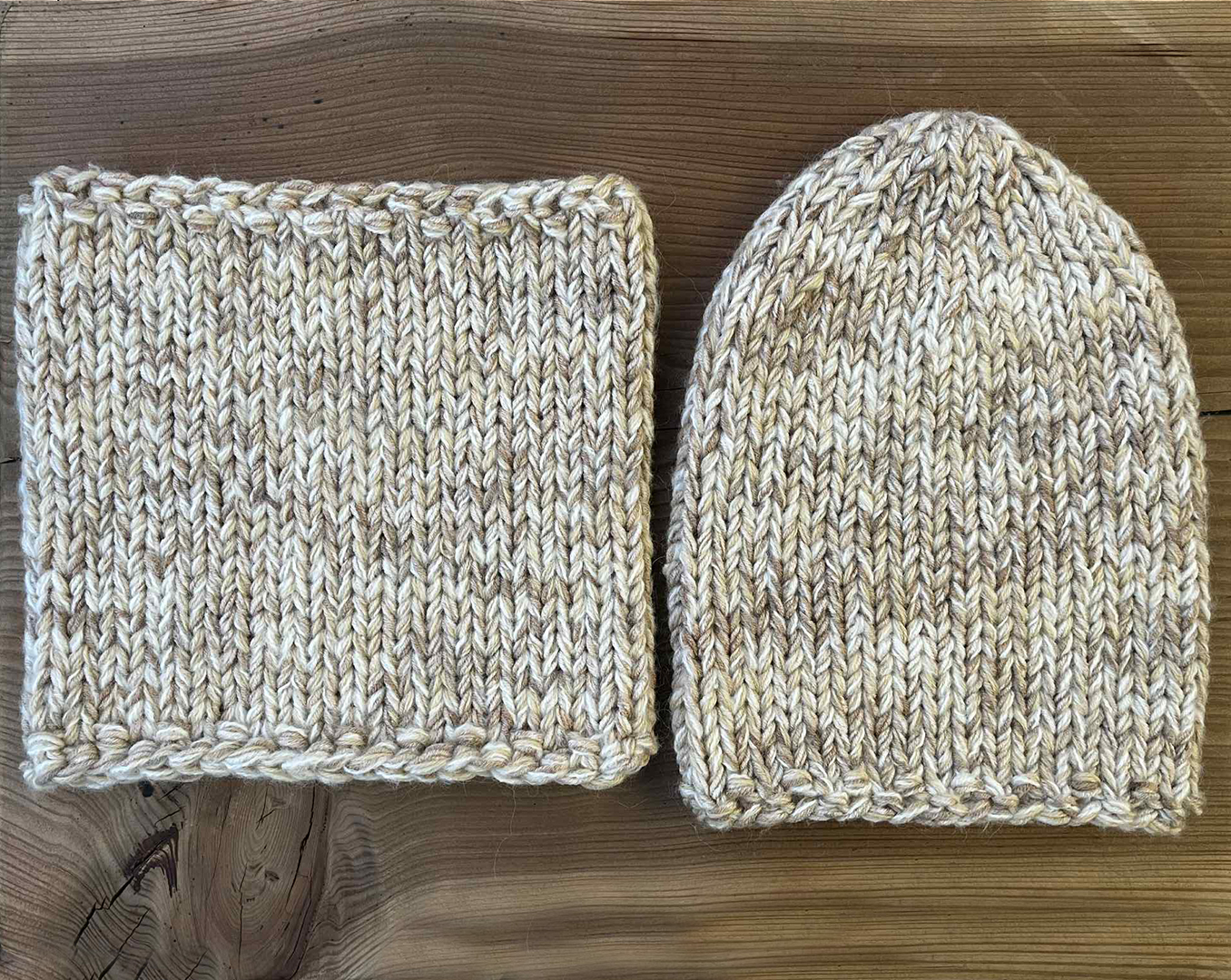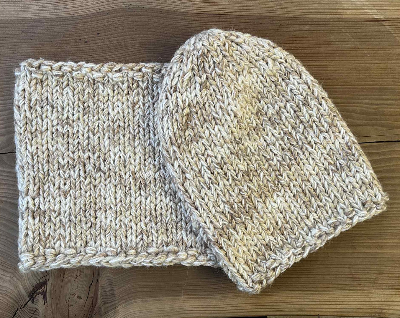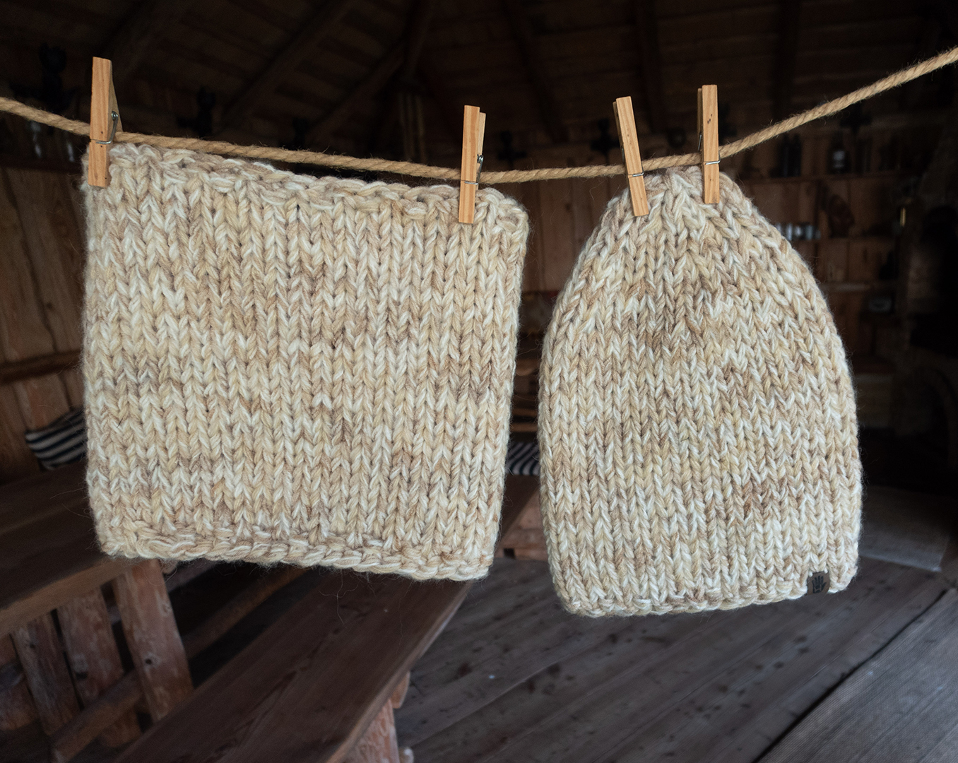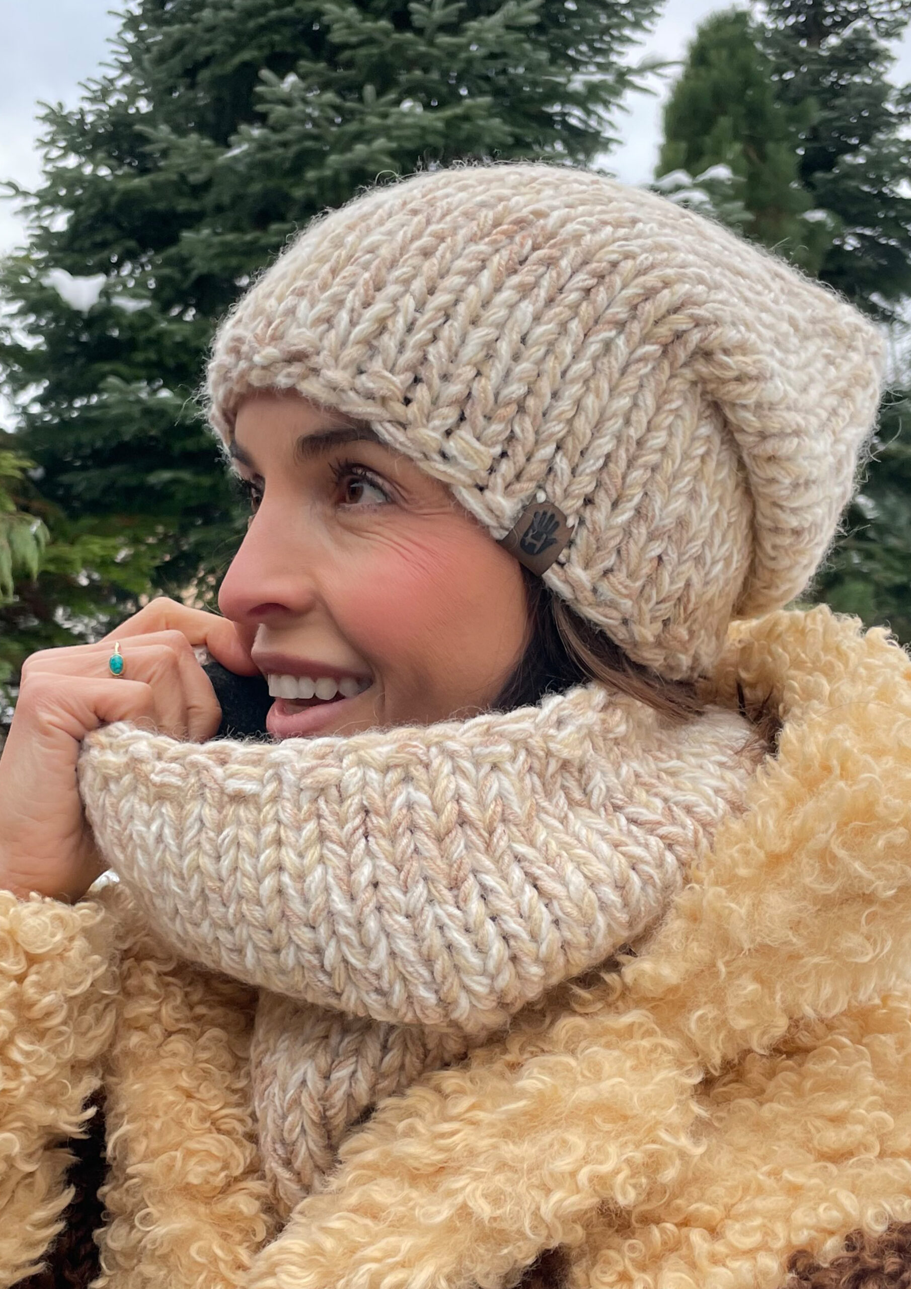 Komplet Sand to ręcznie robione dzieło wykonane na drutach bezszwowo z dbałością o każdy detal. Miękka i przyjemna w dotyku, doskonale dopasowuje się do głowy. Wewnątrz wszyta jest delikatna opaska polarowa, która zapewnia dodatkowy komfort noszenia w chłodne dni.