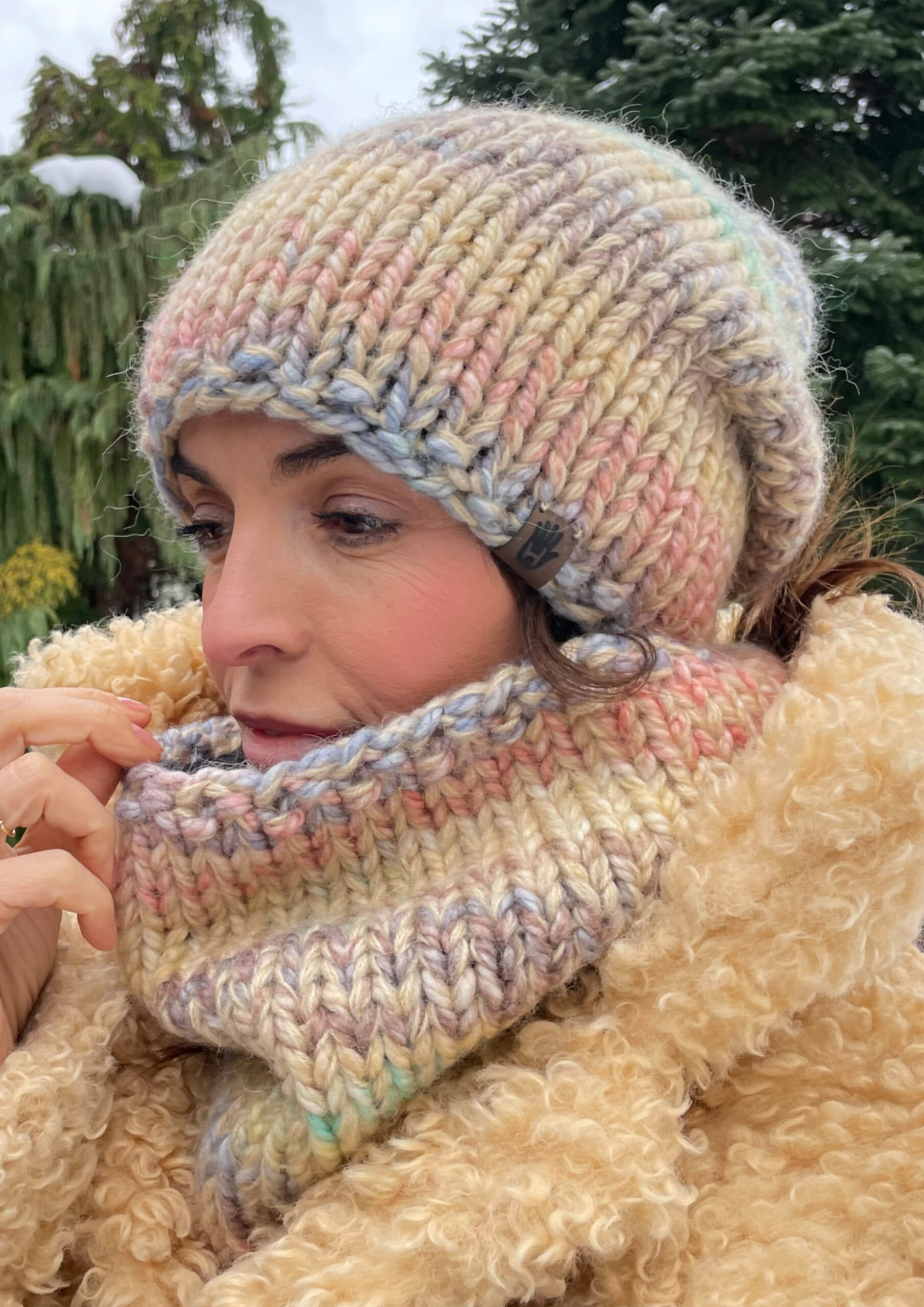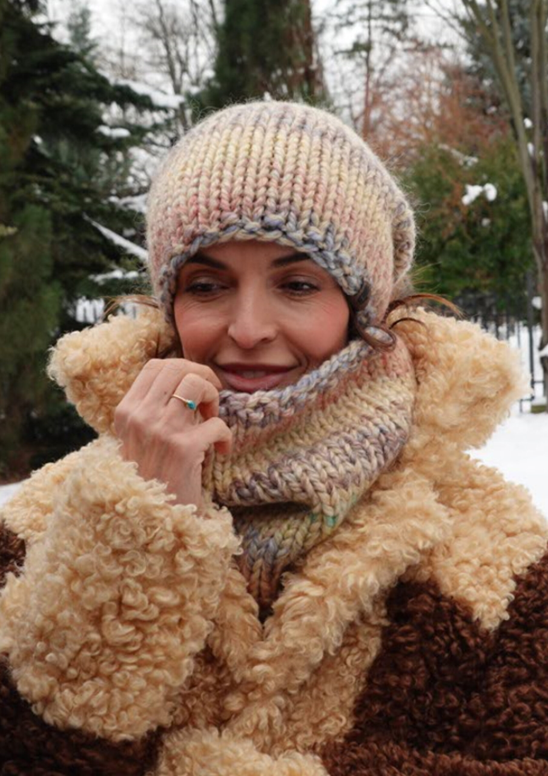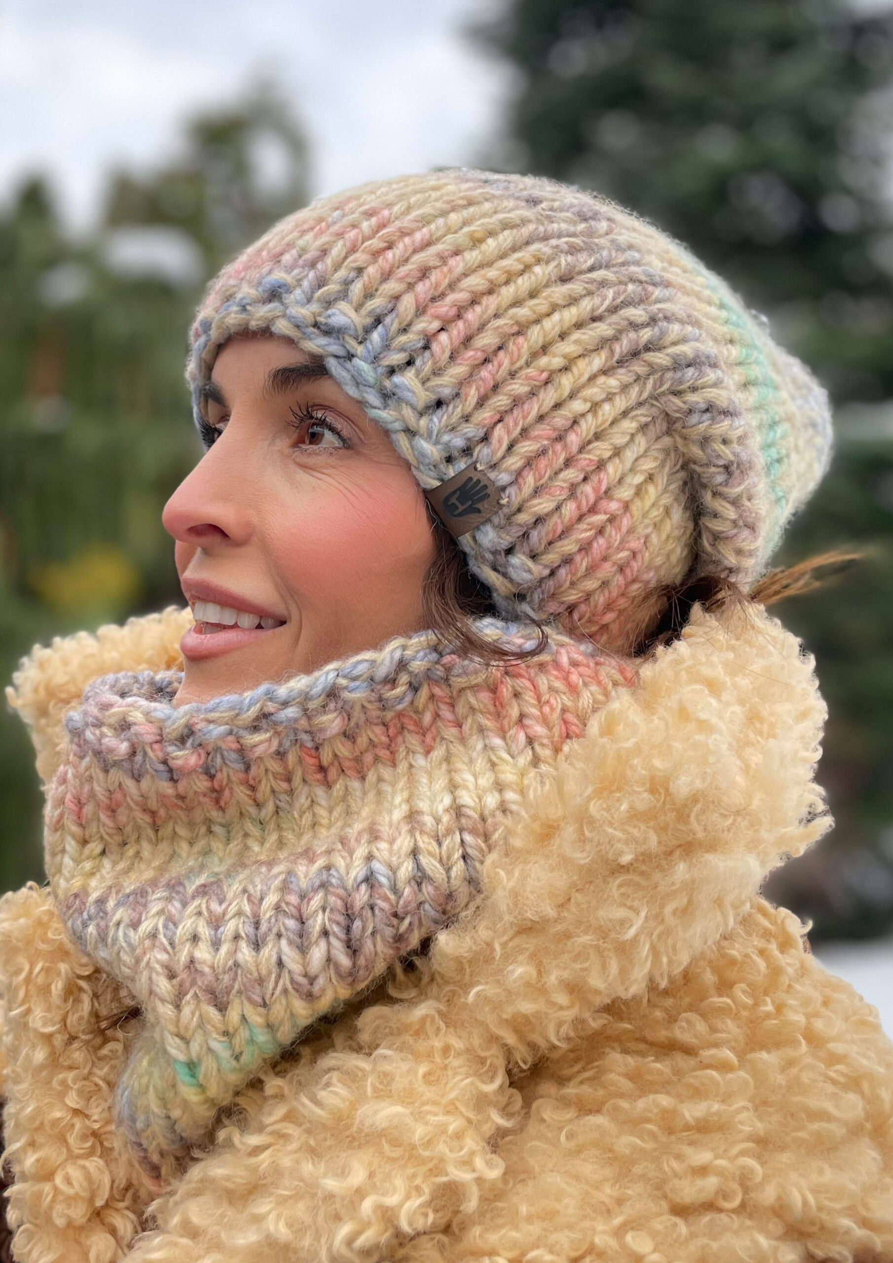 Komplet Spring Melody akryl to ręcznie robione dzieło wykonane na drutach bezszwowo z dbałością o każdy detal. Miękka i przyjemna w dotyku, doskonale dopasowuje się do głowy. Wewnątrz wszyta jest delikatna opaska polarowa, która zapewnia dodatkowy komfort noszenia w chłodne dni.