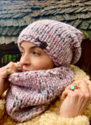 Komplet Wrzos to ręcznie robione dzieło wykonane na drutach bezszwowo z dbałością o każdy detal. Miękki i przyjemny w dotyku, doskonale dopasowuje się do głowy. Wewnątrz wszyte są delikatne opaski polarowe, które zapewniają dodatkowy komfort noszenia w chłodne dni.